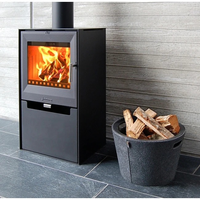 Le poêle à bois Aduro 14 se distingue avec un design cubique, épuré et élégant. Il allie esthétique et performances avec ses 9 kW de puissance permettant de chauffer jusqu’à 140m², son dispositif de régulation automatique de l’air (Aduro-tronic) et son système efficace de nettoyage de la vitre. Sa grande réserve de bois fermée par un battant est utile pour stocker le bois et les accessoires. La porte en fonte du poêle représente aussi un atout pour assurer une meilleure diffusion de la chaleur dans la pièce. La fonte emmagasine la chaleur et la restitue longuement, même après extinction du feu.